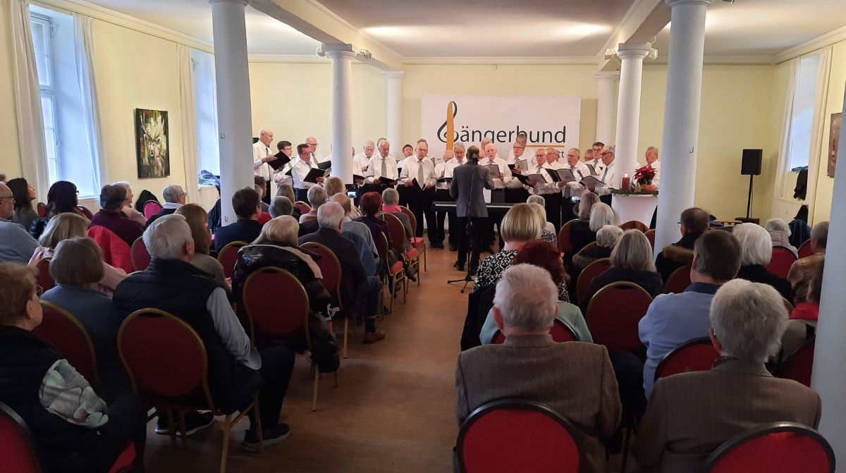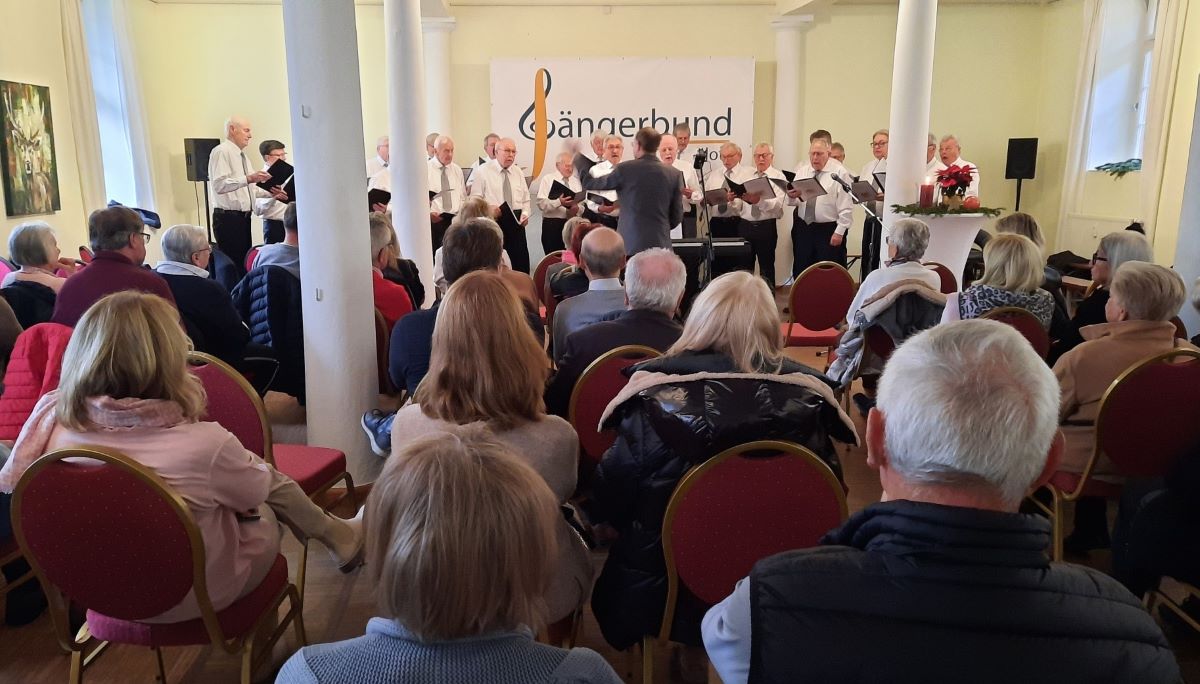 Nach dem Auftakt mit "Die Sonn' erwacht" von Carl Maria von Weber begrüßte der Vereinsvorsitzende Werner Hofmann die Gäste, denen man nach seinen Worten in diesem exklusiven Rahmen die Ergebnisse der Chorarbeit der letzten Monate mit dem neuen Dirigenten Joachim Langnickel vorstellen wolle. Mit Blick auf den ersten Sonntag im Advent hatte er auch einen kleinen historischen Rückblick auf die Entstehung des Adventskranzes parat. Das anspruchsvolle "Schäfers Sonntagslied" von Conradin Kreutzer - der Text stammt aus der Feder des schwäbischen Dichters Ludwig Uhland - machte sodann deutlich, dass der Chor für diesen Tag gut vorbereitet und gut aufgelegt war. Beim Lied "Das Wort heißt Frieden" von Alex Link waren es vor allem Thomas Furrer und Peter Zimmermann, die mit Solo-Einlagen dem Lied eine besondere Note gaben. Mit zwei Evergreens - "Amazing Grace" von John Newton und "Das Lied der Berge", von Toni Ortelli, bekannt auch als "La Montanara" - schufen der Männerchor und Solist Thomas Furrer eine sehr einfühlsame Atmosphäre im Marstall-Saal.
