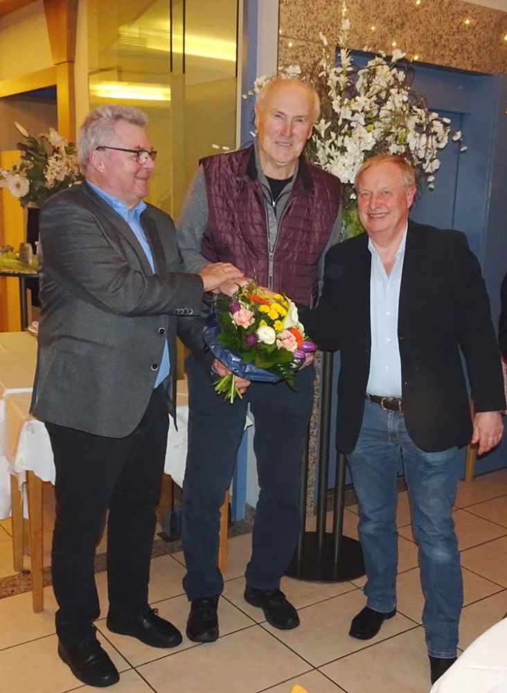 Fünfundsiebzig wurde Willi Grossmann, Sänger im 1. Tenor, noch im zu Ende gehenden Jahr 2018. Somit war gleich in der ersten Singstunde des neuen Jahres eine Feier angesagt. Die beiden 1. Vorsitzenden Werner Hofmann und Peter Zimmermann gratulierten im Namen aller Sänger, die dem Jubilar mit "Welch' ein Geschenk ist ein Lied" von Reinhard Mey, "Träume von der Moldau" aus Smetanas "Die Moldau" sowie mit "Es blüht eine Rose zur Weihnachtszeit" ein Ständchen darbrachten. Sodann durften sie sich anschließend über eine Einladung zum Abendessen freuen.