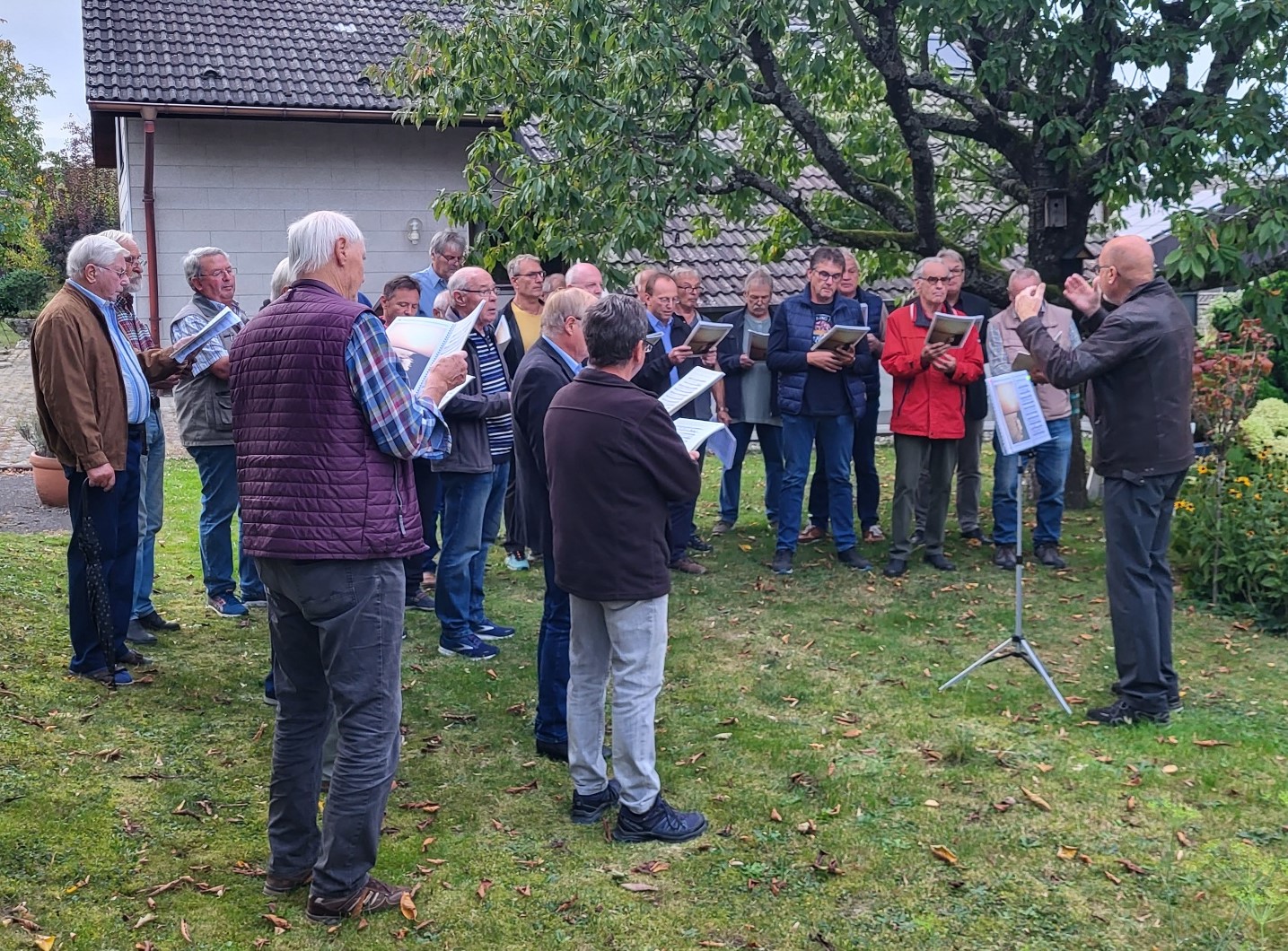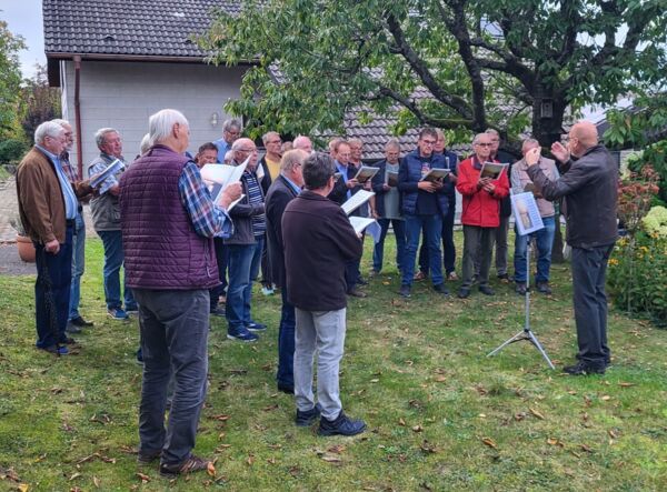 Vier Lieder trug der Männerchor vor – „Wo auf des Tales schmalem Weg“ (von Max Orrel), „Es löscht das Meer die Sonne aus“ (Lied aus der Provence), „Warum bist Du gekommen (Bajazzo) und „Württeberger Wei“ (von Ottmar Gurgeler). Freudig ließen sich die Sänger nach ihrem gelungenen Auftritt zu einem Umtrunk einladen und man plauderte noch ein wenig in kleinen Gruppen - voller Stolz über die "klangvolle Geburtstagsüberraschung" für den Sängerkameraden und -vorstand Peter Zimmermann.