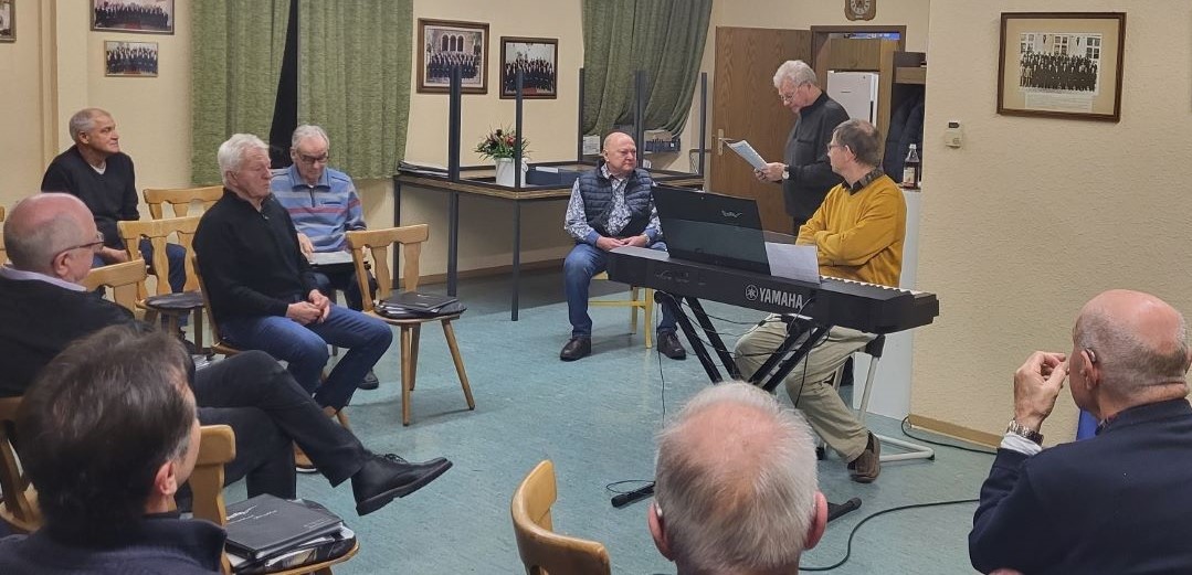 "Ein Freund, ein guter Freund" - dieses Lied wurde in der ersten Chorprobe des neuen Jahres intensiv geprobt, denn es steht auf dem Programm des Frühjahrkonzerts am 22. März 2026 in der Auenhofhalle. Gewissermaßen durfte sich damit auch Harald Mössner angesprochen fühlen, der seinen 75. Geburtstag feierte. Mit - gleichwohl anderen - Liedern leißen ihn seine Sängerkameraden hochleben.