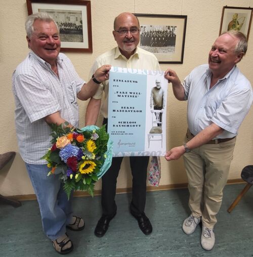 Für sein langjähriges Engagement hatten sich die Sänger nämlich zum Abschied etwas Besonderes einfallen lassen. So erhielt er am Ende der letzten Singstunde – neben dem fast schon obligatorischen Blumenstrauß und einer Flasche Champagner – eine Einladung zu (s)einer „Farewell-Matinée“ im Schloss Bauschlott. Dort erfolgt die offizielle Verabschiedung im Kreis der aktuellen und früheren Sänger sowie der Vereinsmitglieder. Unter der Leitung des neuen Dirigenten, Joachim Langnickel, wird man sich dann auf eine musikalische Zeitreise zu Ehren des scheidenden Chorleiters Bernd Haberstroh begeben.