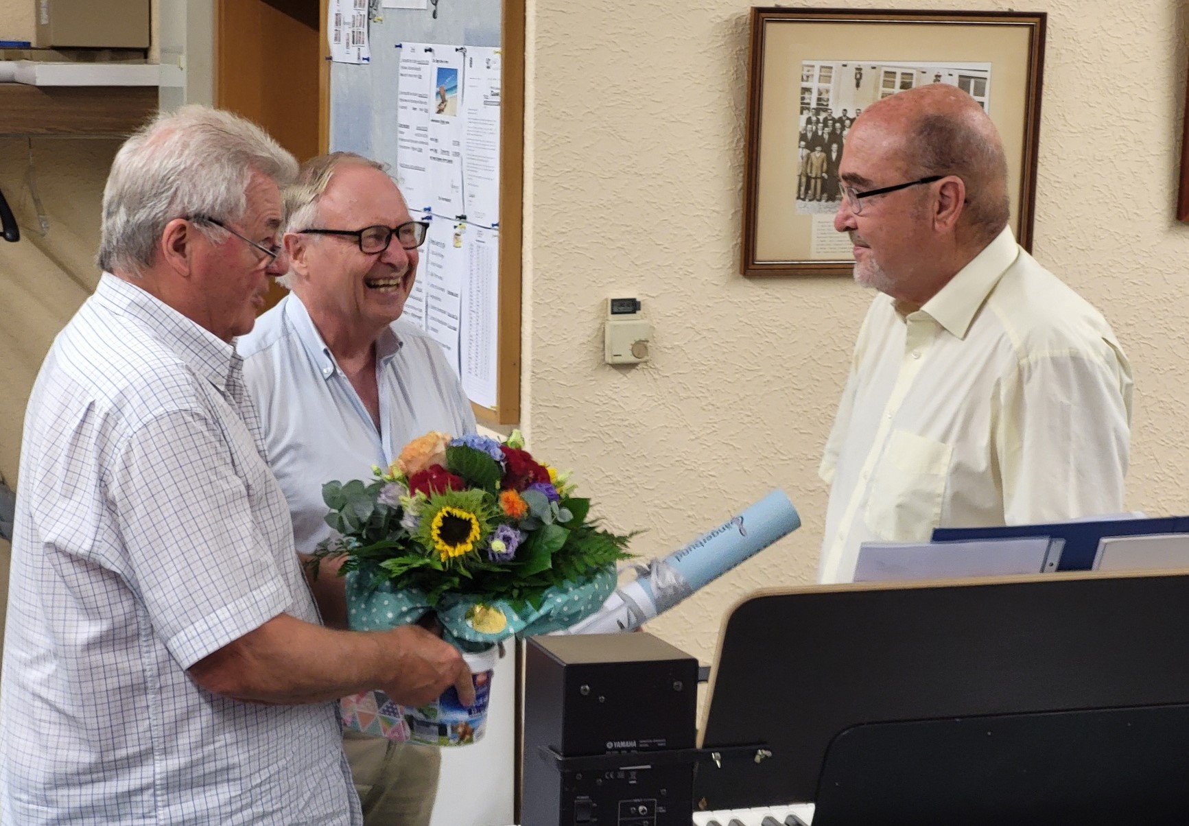 Es war die letzte Chorprobe - Singstunde genannt - für Bernd Haberstroh. Und es war die letzte vor den Sommerferien sowie die letzte vor dem Auftritt auf dem Bauschlotter Straßenfest. Von daher stand erst einmal das finale Proben der Lieder für das Straßenfest im Vordergrund. So ganz konnte sich freilich niemand an diesem Abend von dem Gedanken befreien, dass eine Zäsur bevorsteht. Am Ende dieser Singstunde bedankte sich Bernd Haberstroh in bewegenden Worten bei den Sängern für die Zusammenarbeit und das Vertrauen. Werner Hofmann, Co-Vereinsvorsitzender, erwiderte dies entsprechend im Namen des Vereins und des Männerchors - nicht ohne darauf hinzuweisen, dass dies nicht die finale Verabschiedung sei.