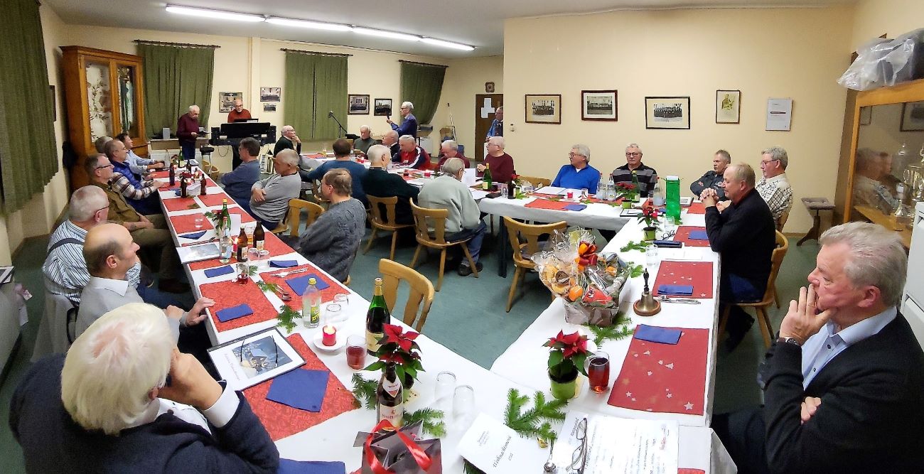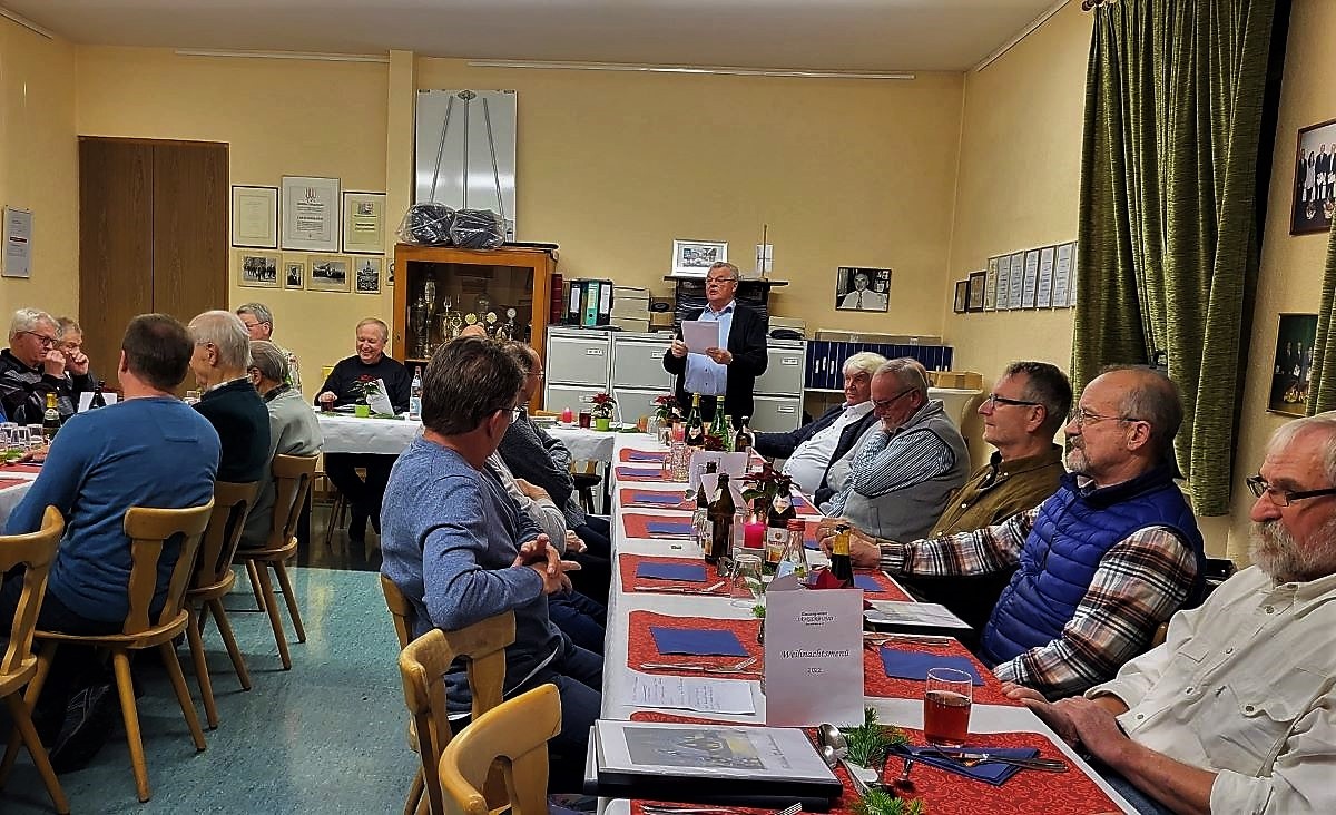 Das zu Ende gehende Sängerjahr - es war aufgrund der anfänglich noch wirksamen Corona-Vorgaben gewissermaßen ein "Kurzschuljahr" - konnte endlich einmal wieder würdig beendet werden. So kamen am letzten Montag vor Heiligabend die Sänger des Männerchors noch einmal im Sängerheim zusammen, um im Rahmen einer Weihnachtsfeier auf 2022 zurückzublicken. Sängervorstand und Co-Vereinsvorsitzender Peter Zimmermann hob in seiner Begrüßung hervor, dass man es geschafft habe, seit dem Frühjahr und nach der langen Corona-Auszeit wieder einen Chorklang zu erreichen, der mehr als zufrieden stellt. Großen Anteil daran habe der Dirigent Bernd Haberstroh, aber auch der Zusammenhalt im Chor, der gewissermaßen die Grundlage für das musikalische Harmonieren schafft. Bernd Haberstroh bedankte sich seinerseits bei Vorstand und Sängern und brachte seine Vorfreude auf die weitere Zusammenarbeit im Neuen Jahr zum Ausdruck. Schließlich ergriff auch Werner Hofmann in seiner Eigenschaft als Vereinsvorsitzender das Wort und durfte dabei vor allem den besonders engagierten Sängerkameraden Dank aussprechen und ein Weinpräsent überreichen.