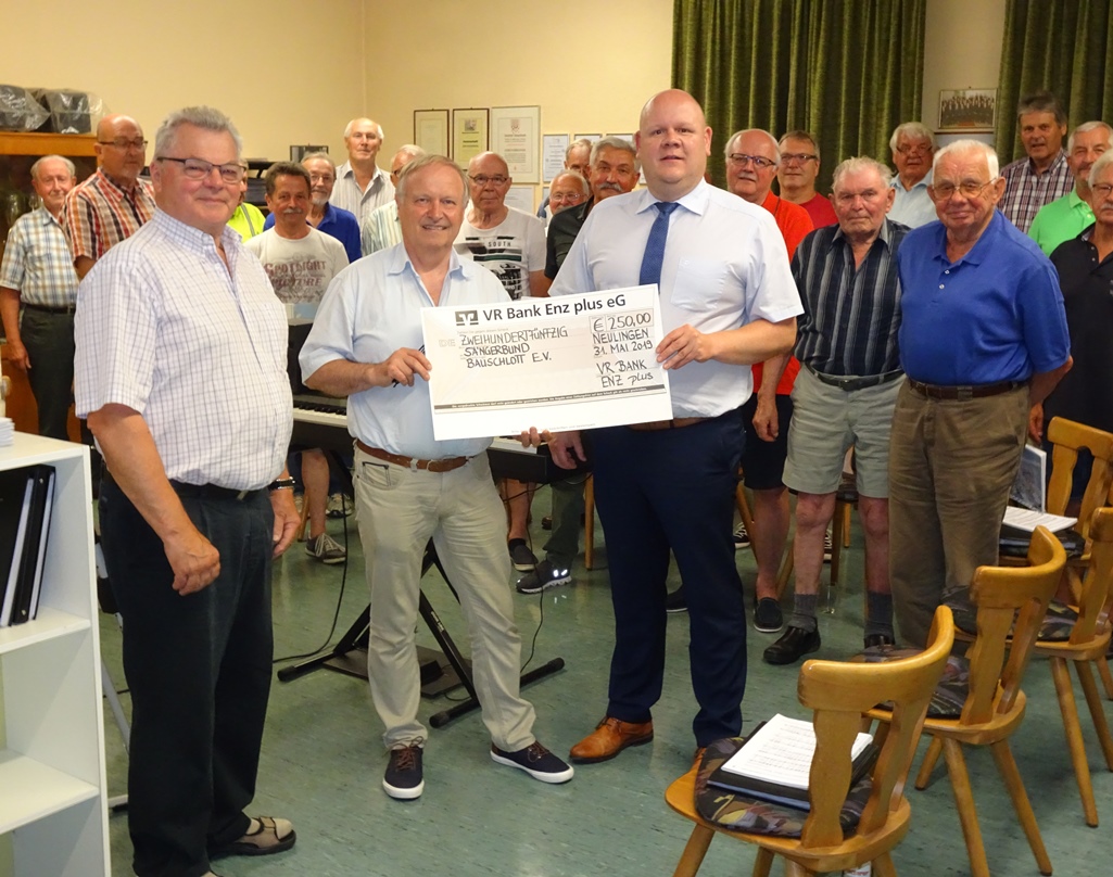In den Vorjahren konnte sich der Sängerbund immer wieder über eine Spende der Raiffeisenbank Bauschlott freuen und diese Freude wird auch nach der Fusion zur VR Bank Enz plus eG weiter bereitet. So erhielt man jüngst am Ende einer Singstunde im Sängerheim (Alte Schule) aus den Händen von Torsten Uhrig einen Spendenscheck der VR Bank Enz plus eG über 250 €.